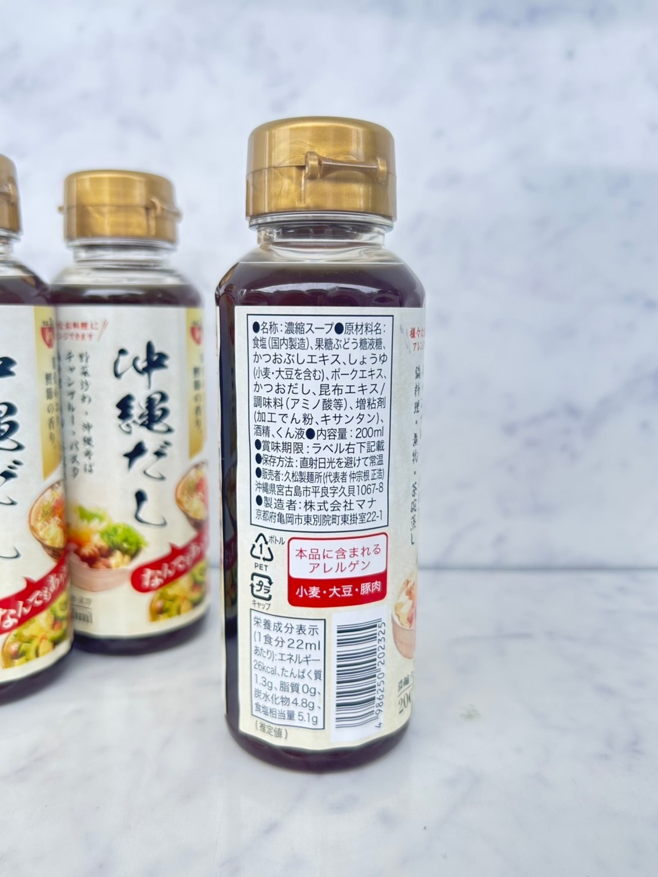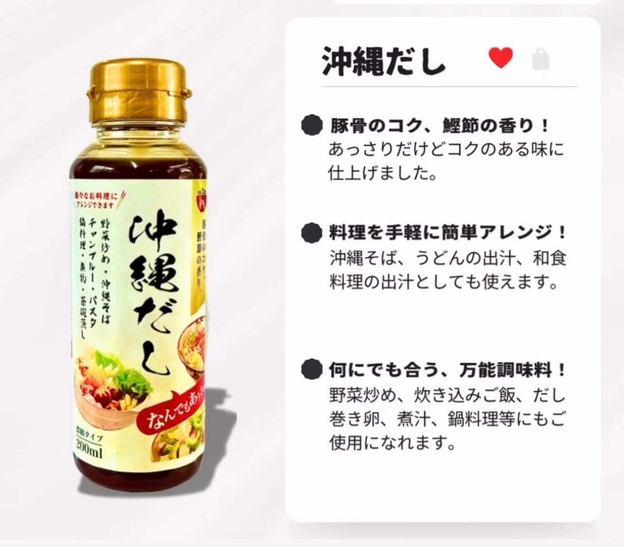 鰹節と昆布の出汁をベースに、宮古島ならではの味わいを再現しています。これ一本でいつもの料理がワンランク上の美味しさに。