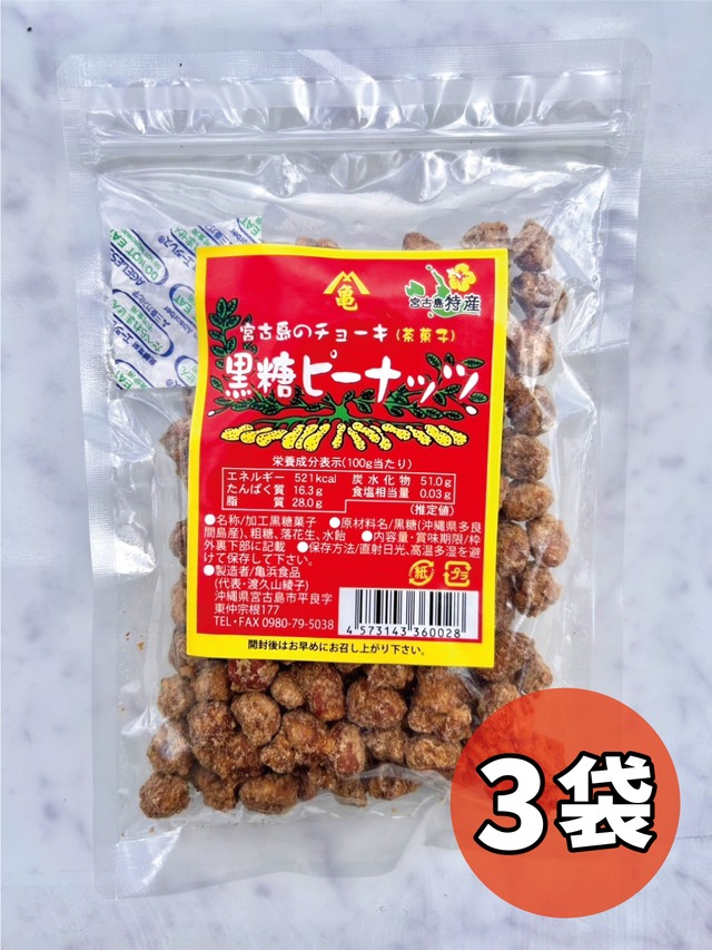 宮古島の老舗お土産店「亀浜おみやげ品店(亀浜食品)」の、 宮古島のチョーキ(宮古島方言で茶菓子)黒糖ピーナッツ スタッフ一押しの宮古島のお菓子をご紹介♪ 黒糖ピーナッツとは、 宮古島に昔からある、サトウキビを原料とした伝統的なお菓子。 炒ったピーナッツを黒糖でコーティングしただけの、素朴だけどどこかクセになる宮古島のお菓子の代表格! 一度食べたら止まらなくなります笑 その黒糖の甘さとピーナッツの香ばしさ、そしてカリッとした食感は昔から宮古島で老若男女最も親しまれているお菓子です。 全国で販売しているのは ”宮古島” だけっ!!! ぜひこの機会にお試しあれ〜 内容量:140g×3袋
